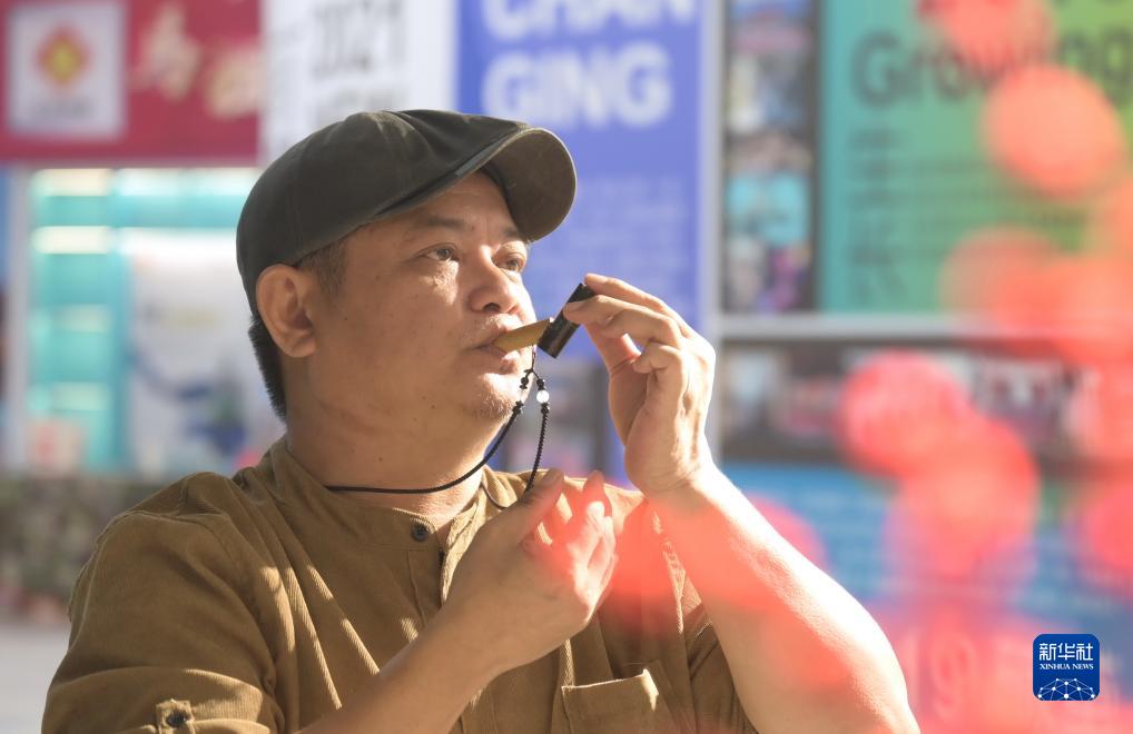 10月25日,黃守堃在演奏漆藝竹鳥笛。