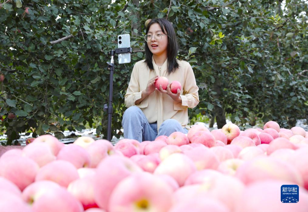 10月26日,在河北順平縣南神南村果園,一名主播通過網絡直播推銷蘋果。
