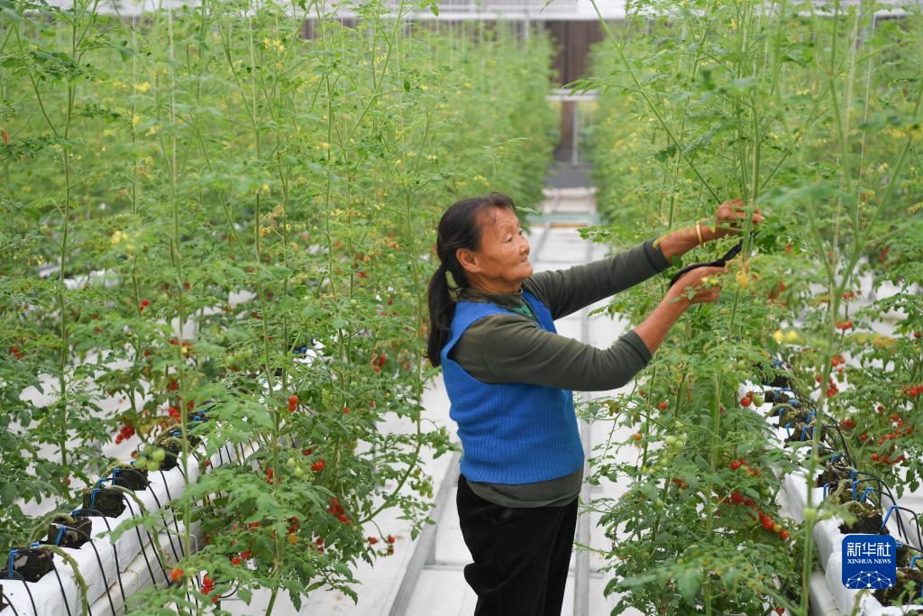 10月25日,工作人員在魯渝(壽光)蔬菜現代產業園南門科技示范園西紅柿種植大棚內修枝。