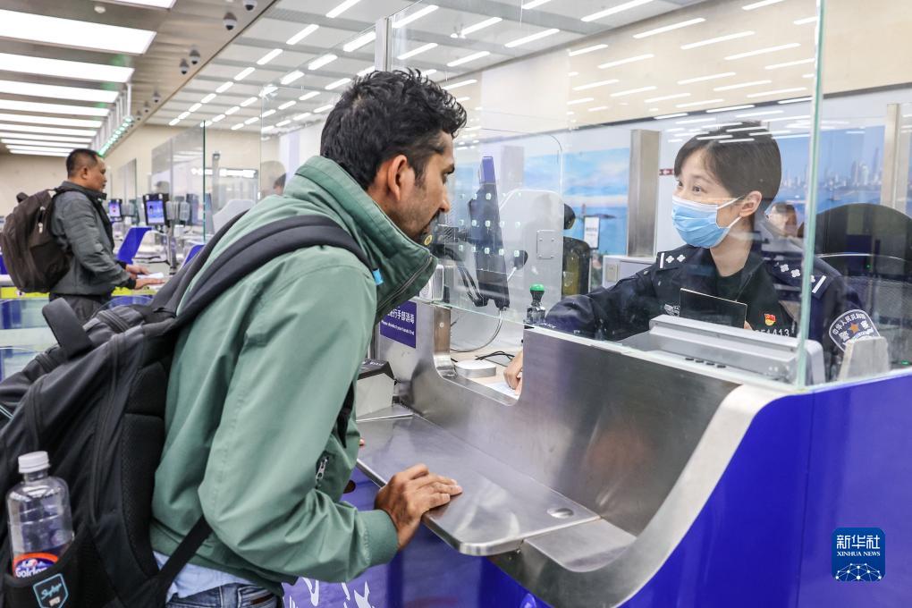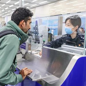 10月25日,在青島膠東國際機場,一位外籍旅客在山東出入境邊防檢查總站青島機場邊檢站辦理入境通關手續。