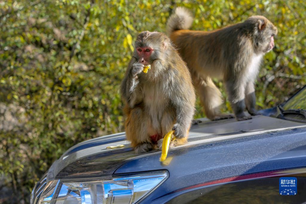 藏獼猴蹲在車頂上吃游客喂食的香蕉(10月25日攝)。