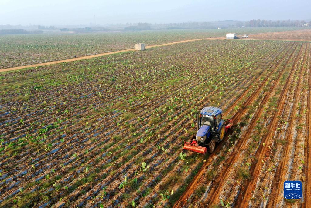 10月26日,農機在青島市即墨區金口鎮的田間收獲芋頭(無人機照片)。