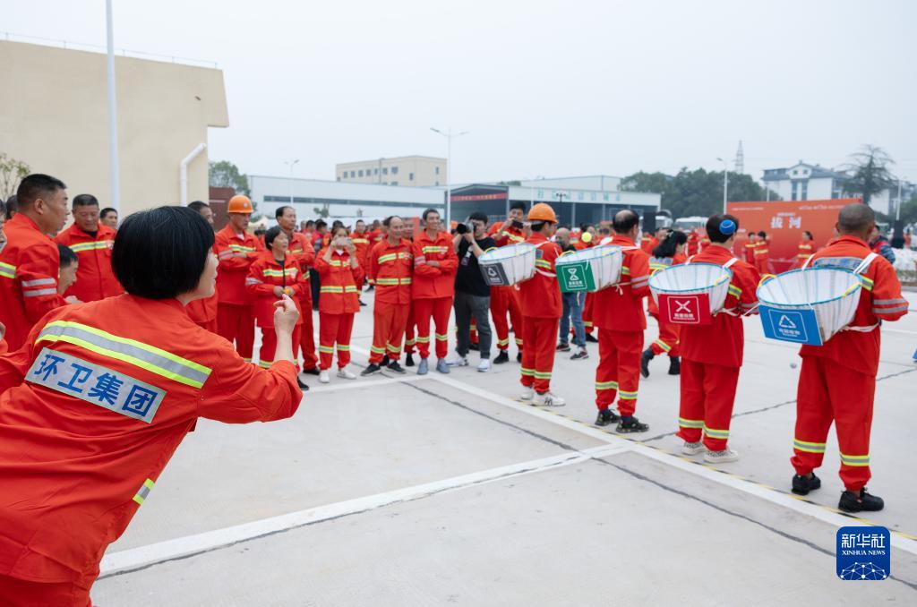 10月26日,浙江省諸暨市的環衛工人參加垃圾分類投球比賽。
