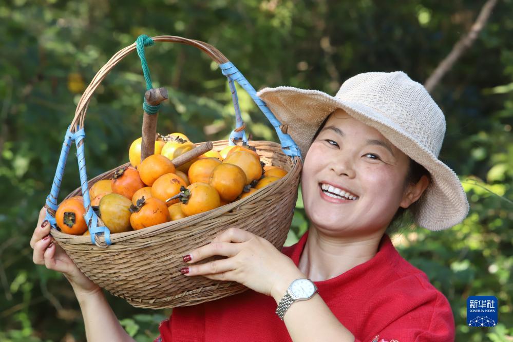 10月24日,在浙江省臺州市路橋區峰江街道白楓岙村,村民展示采摘的柿子。