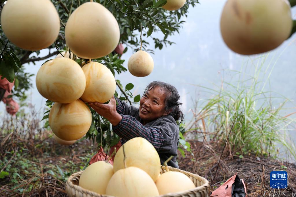 10月26日,村民在貴州省開陽縣花梨鎮清江村蜜柚種植基地里采摘柚子。