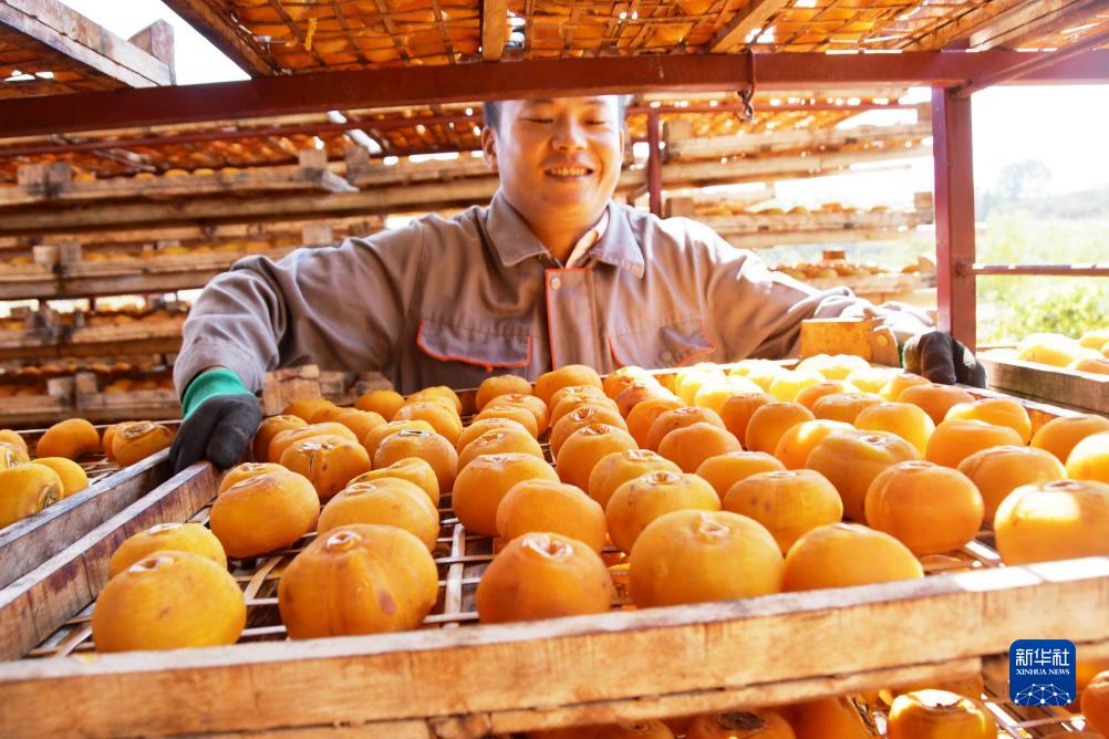 10月15日,廣西桂林市恭城瑤族自治縣嘉會鎮秧家村柿農在晾曬柿子。