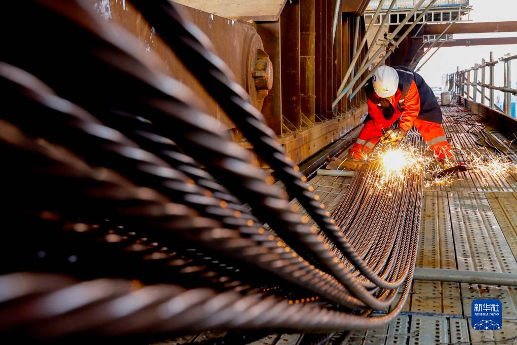 10月26日,工人在中心平臺裝船作業現場進行焊接作業。