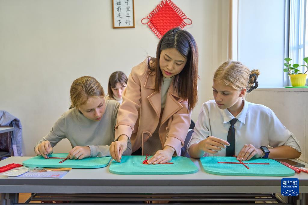 10月26日,在俄羅斯符拉迪沃斯托克的遠東聯邦大學孔子學院,來自吉林省的手工藝人徐曉雪(中)教學生制作中國結。