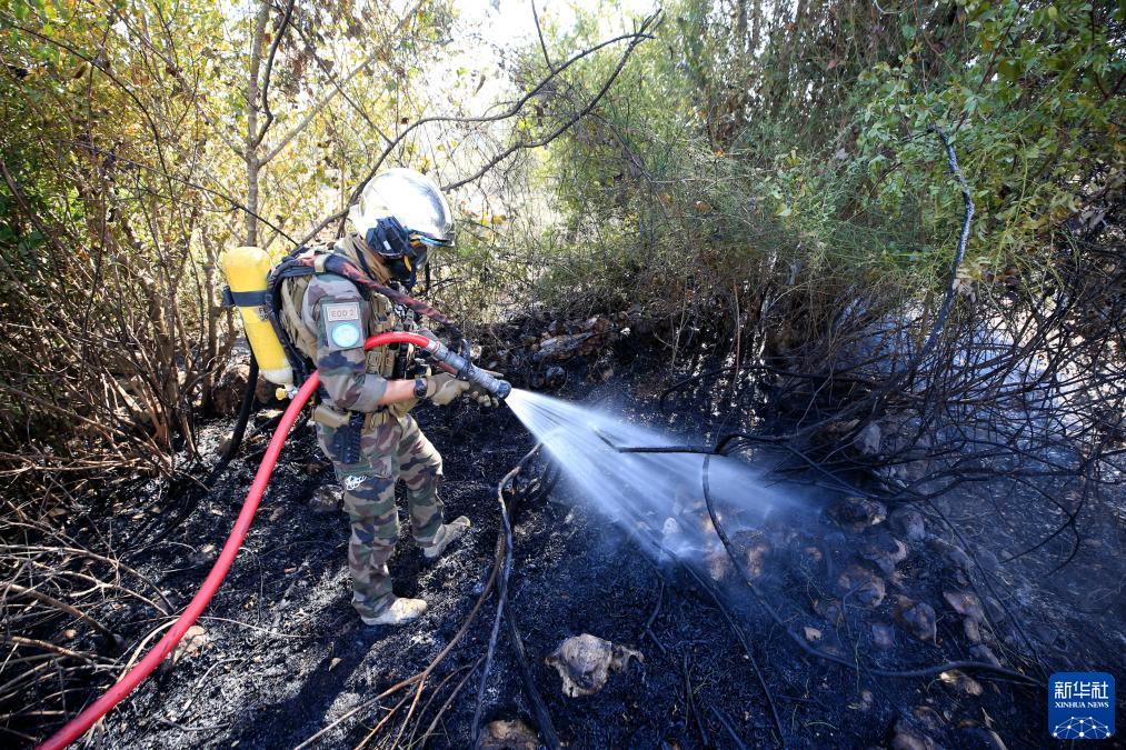 10月26日,聯合國駐黎巴嫩臨時部隊士兵在黎巴嫩阿勒馬沙卜的以軍炮擊地點滅火。