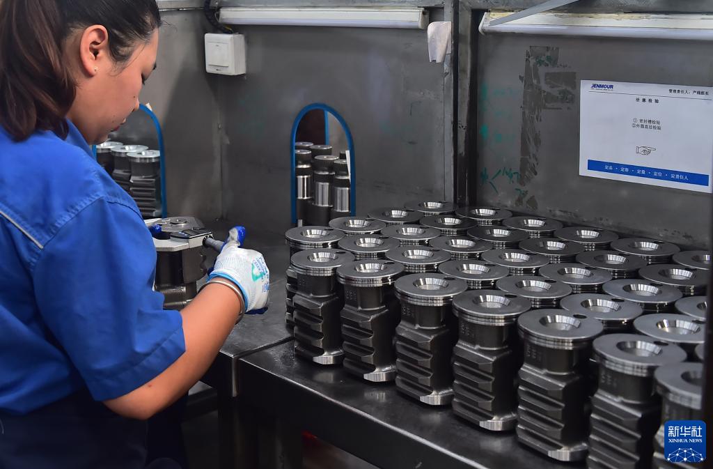 10月25日,在金馬工業集團股份有限公司生產車間,技術工人在檢驗活塞產品。