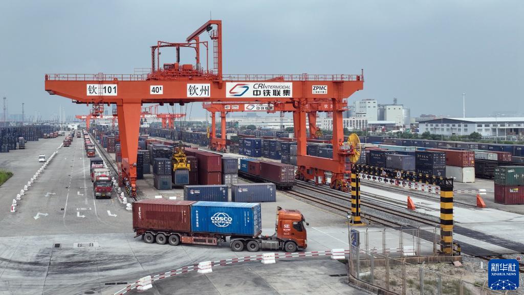 10月26日,在欽州鐵路集裝箱中心站貨場,火車和汽車正在轉運集裝箱(無人機照片)。