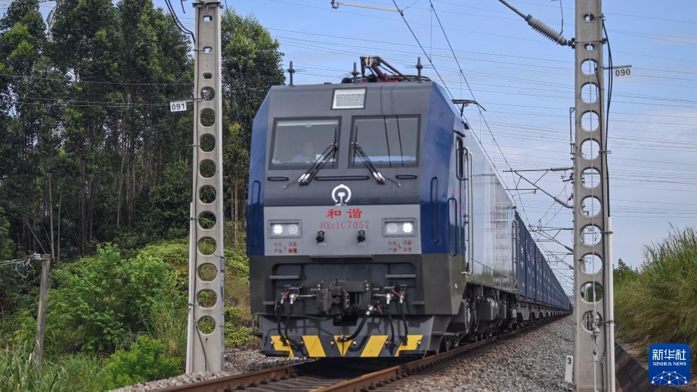 一列滿載集裝箱的火車駛離欽州港東站(10月9日攝)。