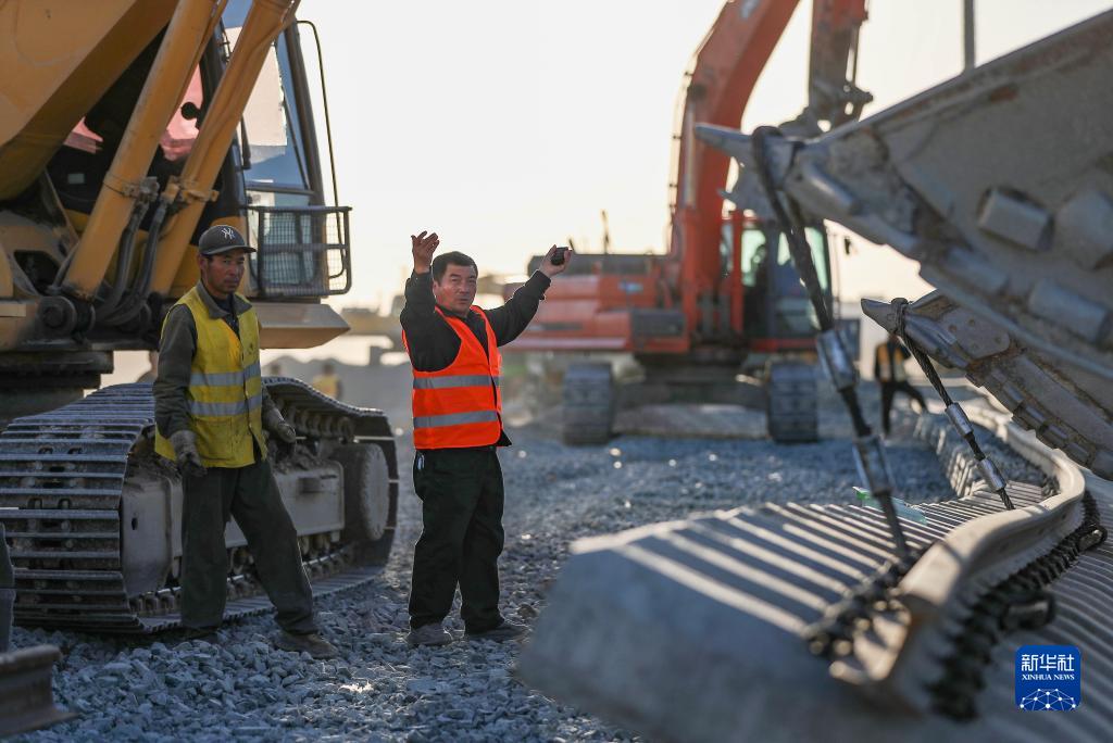 10月26日,施工人員在錦承線金溝站(不含)-朝陽南站(不含)區間段轉正線改造封鎖施工現場引導施工機械作業。