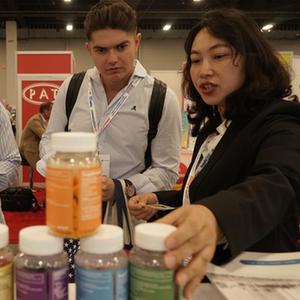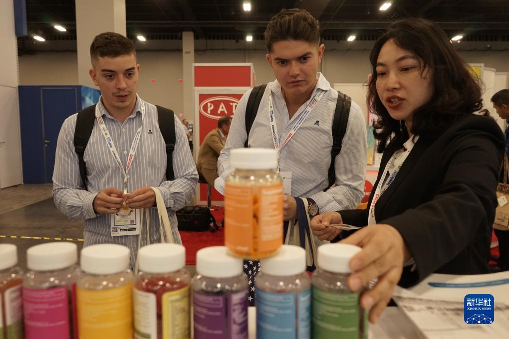 10月25日,在美國拉斯維加斯2023年中國醫藥原料品牌展上,工作人員在廣東億超生物展區向參觀者介紹產品。