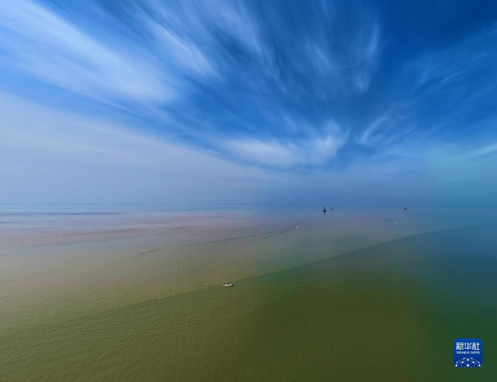 2023年10月12日在山東省東營市拍攝的黃河水和海水交界的場景(無人機照片)。