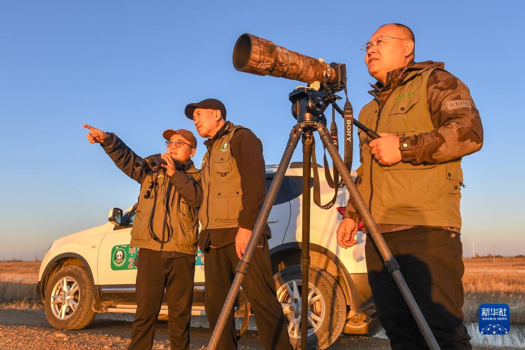 10月26日,中國野生動物保護協會吉林白城護飛隊隊員王巖(左)、張惠超(中)和姜海濤觀察、拍攝候鳥。