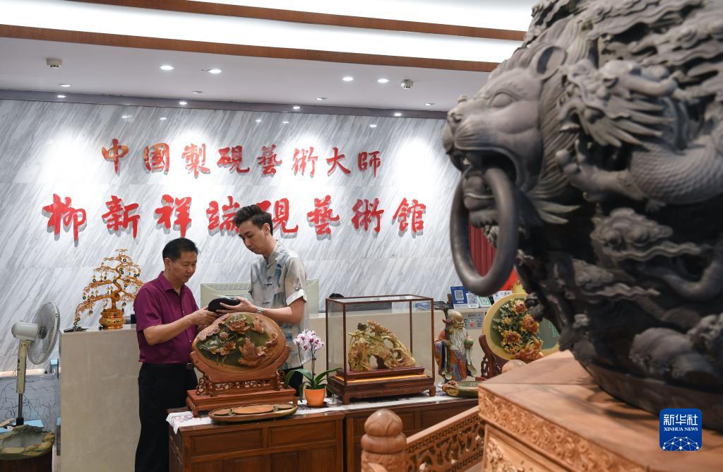10月26日,在廣東肇慶柳新祥端硯藝術館,柳新祥(左)和兒子柳飛在討論端硯作品。