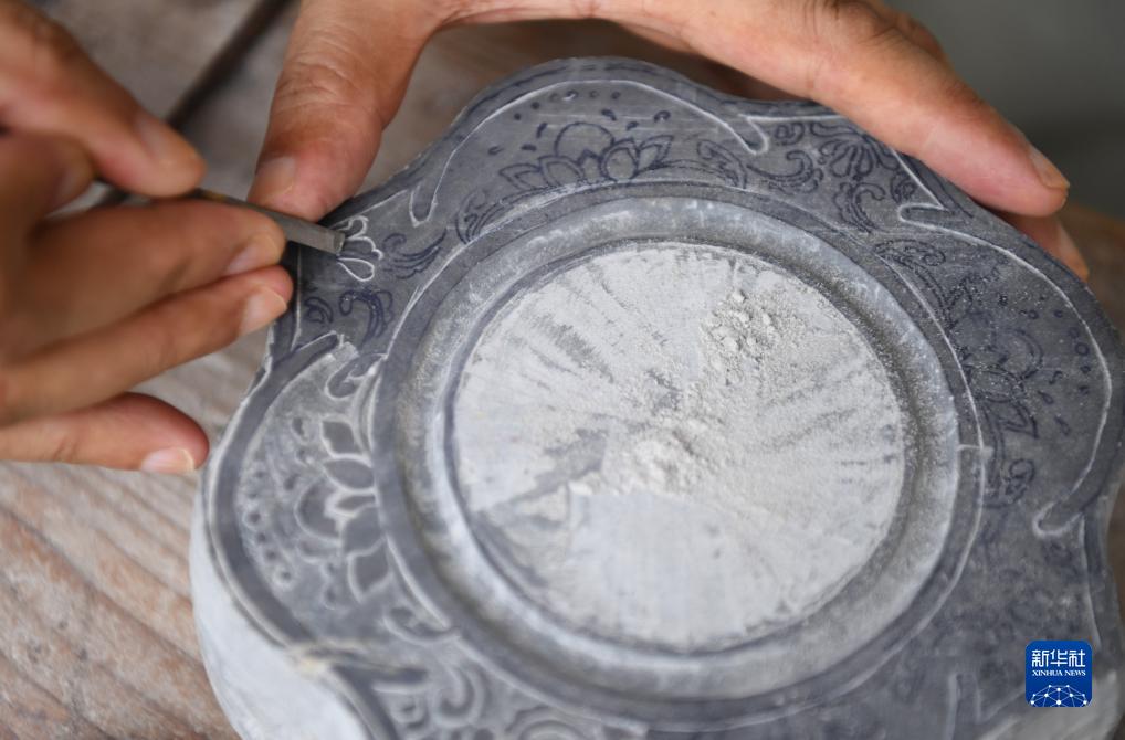 10月26日,在廣東肇慶端硯文化村的加工車間,柳新祥給肇慶學院的實習生講授示范端硯雕刻技法。