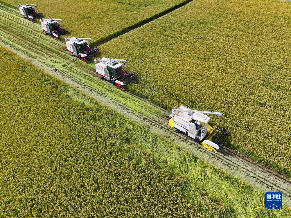 10月27日,無人駕駛機械(前)和有人駕駛機械在江蘇省南通市通州區十總鎮育民村高標準農田收割水稻(無人機照片)。
