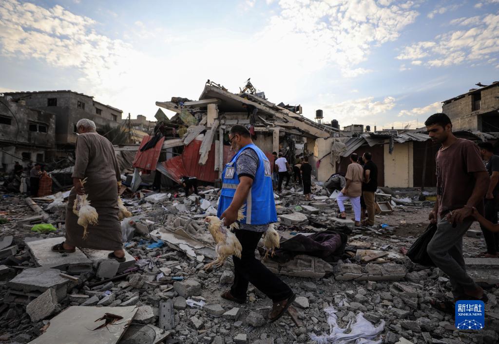10月27日,在加沙地帶南部城市汗尤尼斯,人們經過以軍襲擊后的房屋廢墟。