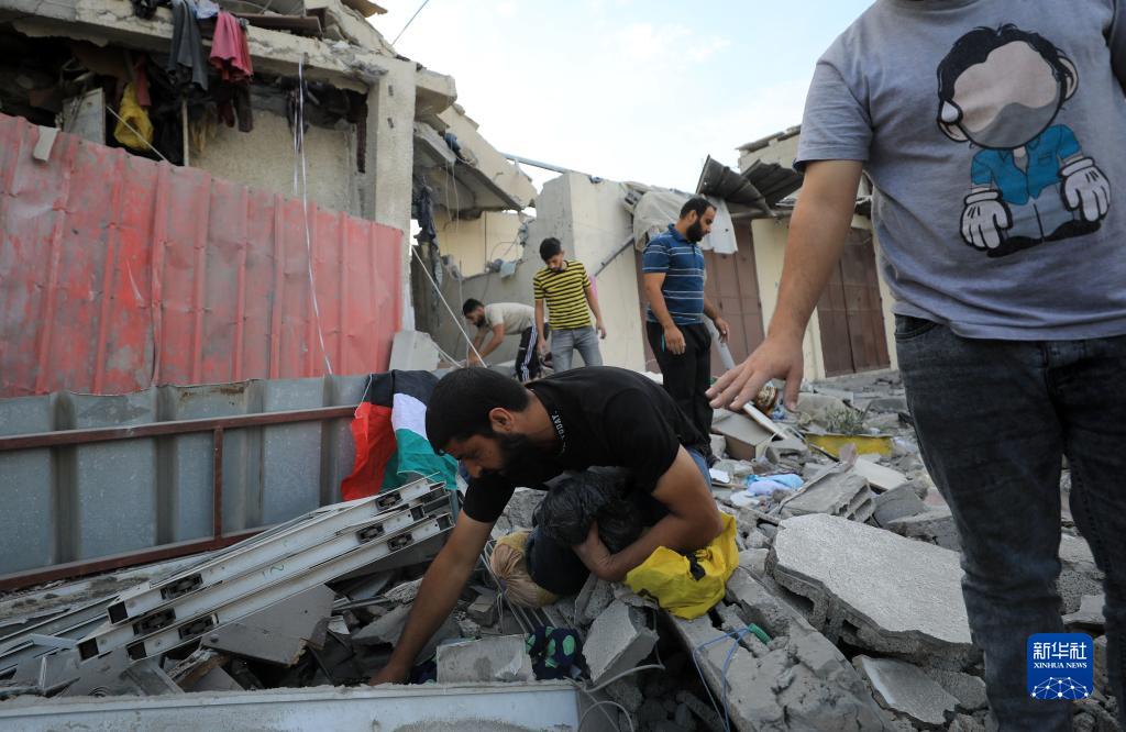 10月27日,在加沙地帶南部城市汗尤尼斯,巴勒斯坦人查看以軍襲擊后的建筑廢墟。