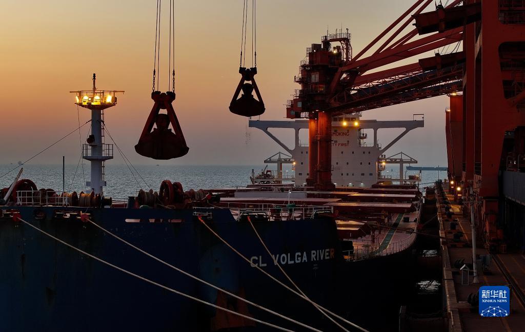 10月27日,一艘輪船靠泊在唐山港曹妃甸港區礦石碼頭卸載(無人機照片)。