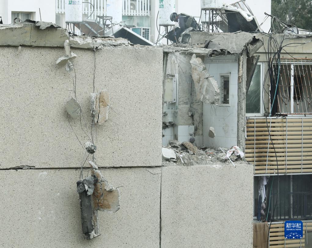 這是10月27日在以色列特拉維夫拍攝的遭到火箭彈襲擊的受損建筑。