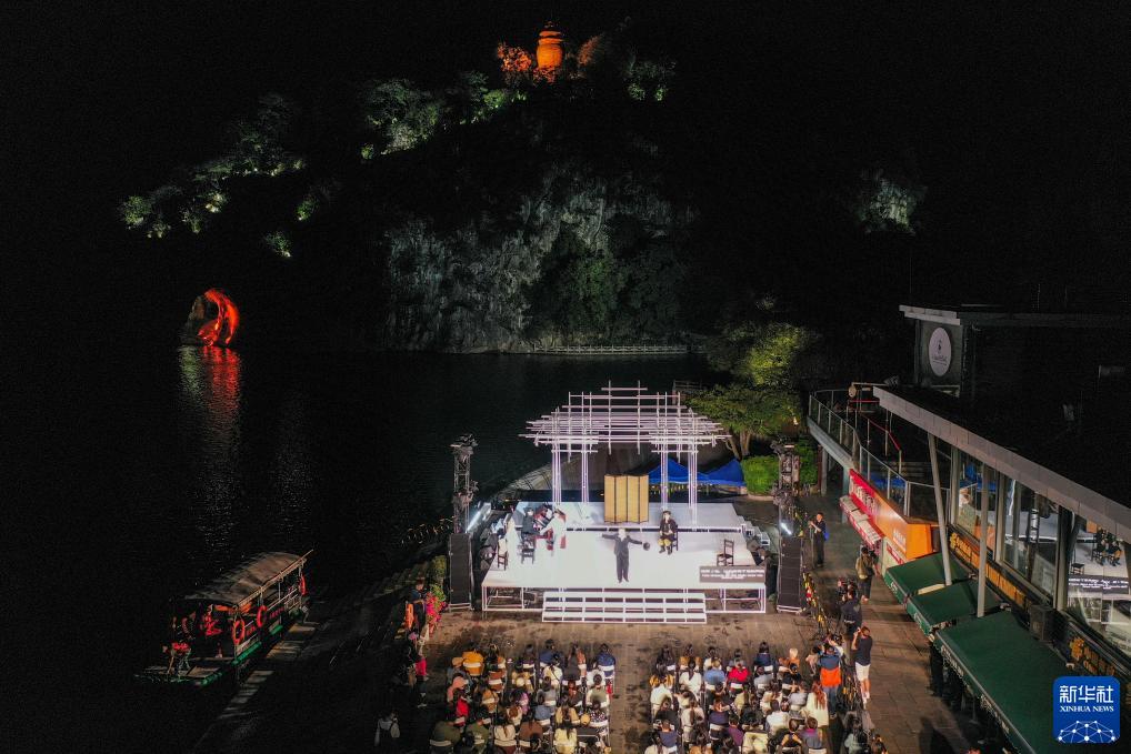10月27日晚,在廣西桂林市象山公園,演員們在表演歌?。o人機照片)。