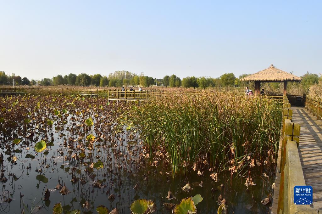 10月26日在山東省聊城市位山灌區拍攝的在引黃工程沉淀池區開發的位山黃河公園一角。位山灌區是黃河流域具有跨流域調水和生態保護功能的重要水利設施。
