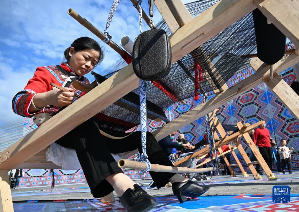 當日,數十名織錦女工在湖北省來鳳縣龍鳳文化中心廣場現場進行“西蘭卡普”制作,普及非遺文化。