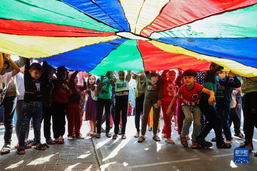 10月23日,在加沙地帶南部,兒童在聯合國近東巴勒斯坦難民救濟和工程處一所附屬學校內做游戲。