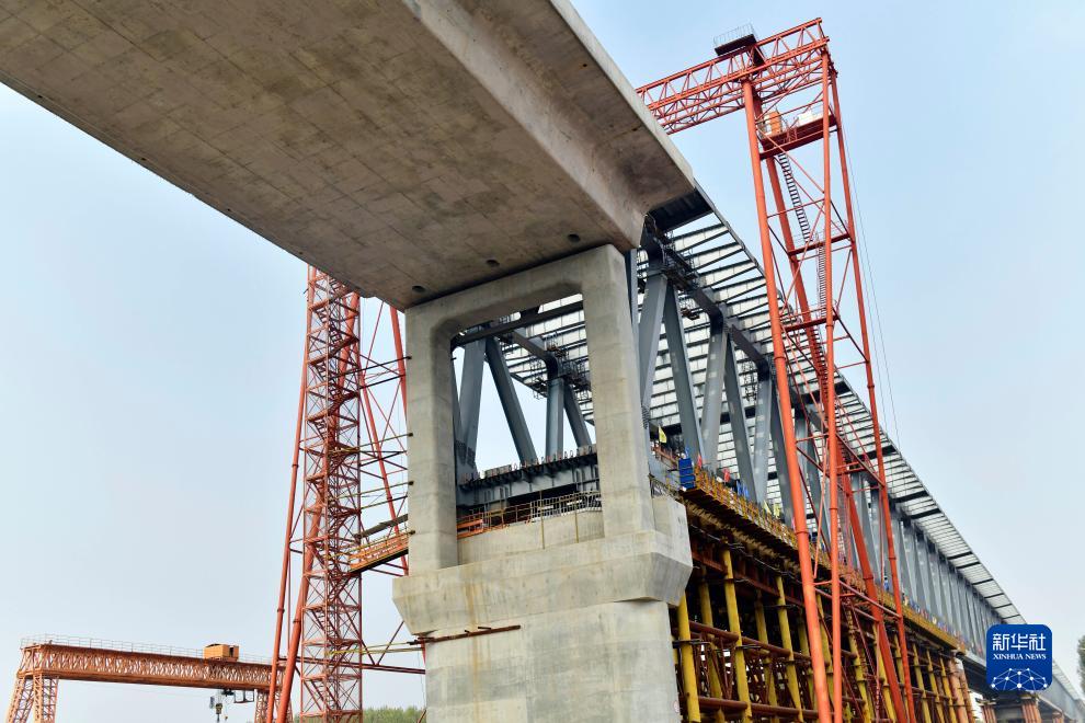 10月28日,在聊(城)泰(安)鐵路黃河公鐵橋項目,中鐵一局的工作人員在進行合龍作業。