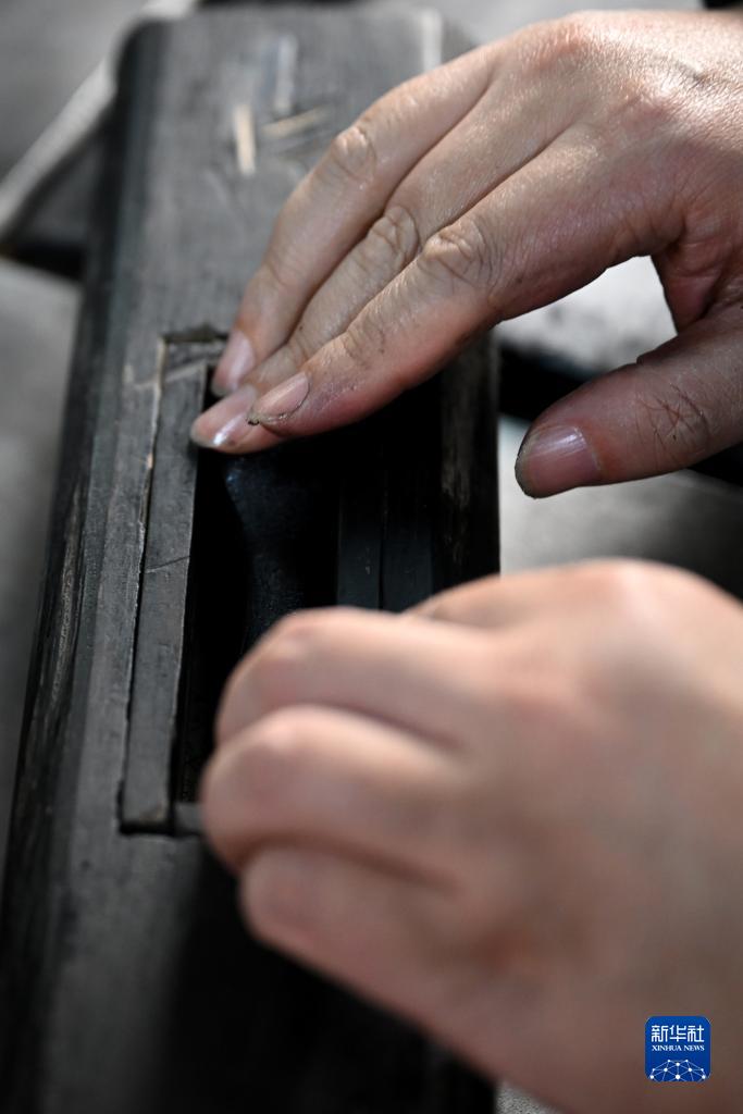 10月24日,在安徽省黃山市歙縣老胡開文墨業有限公司,周健將揉搓好的墨條放入墨模。