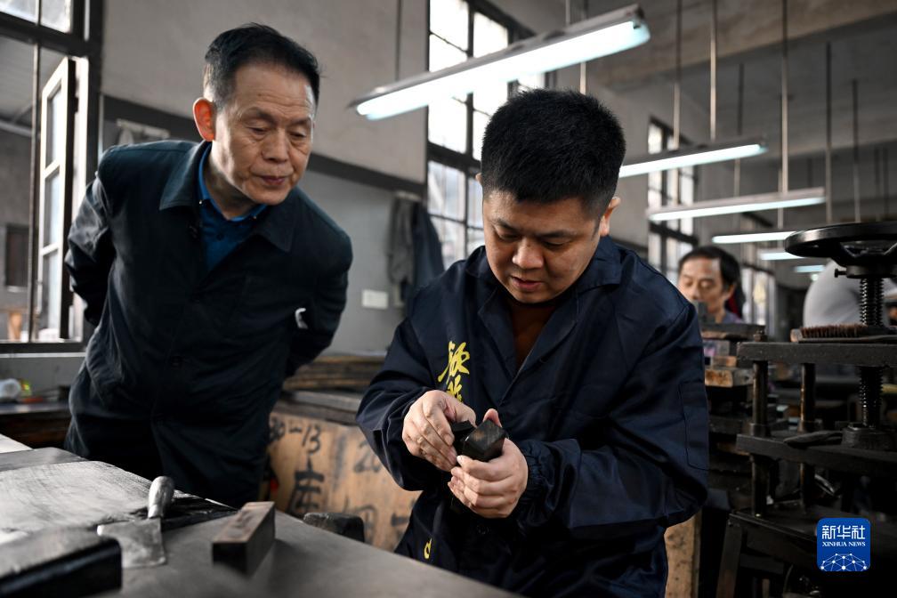 10月24日,在安徽省黃山市歙縣老胡開文墨業有限公司,周?。ㄓ遥┰诟赣H周美洪的注視下從墨模中取出壓制好的墨。