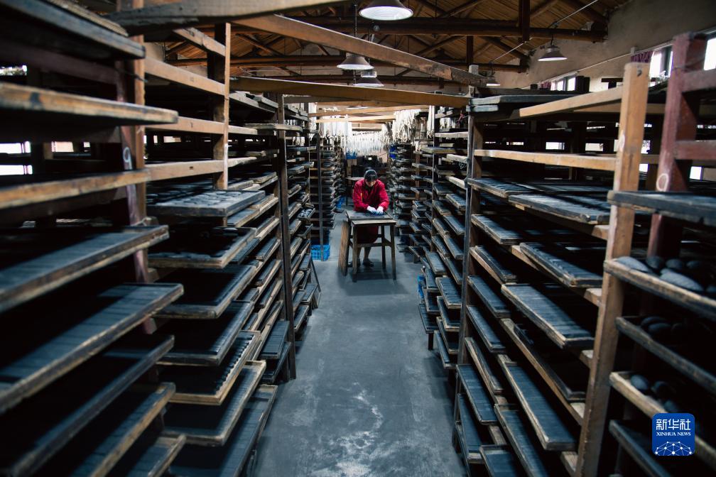 10月24日,在安徽省黃山市歙縣老胡開文墨業有限公司,工人在晾墨車間查看通風晾制的墨。