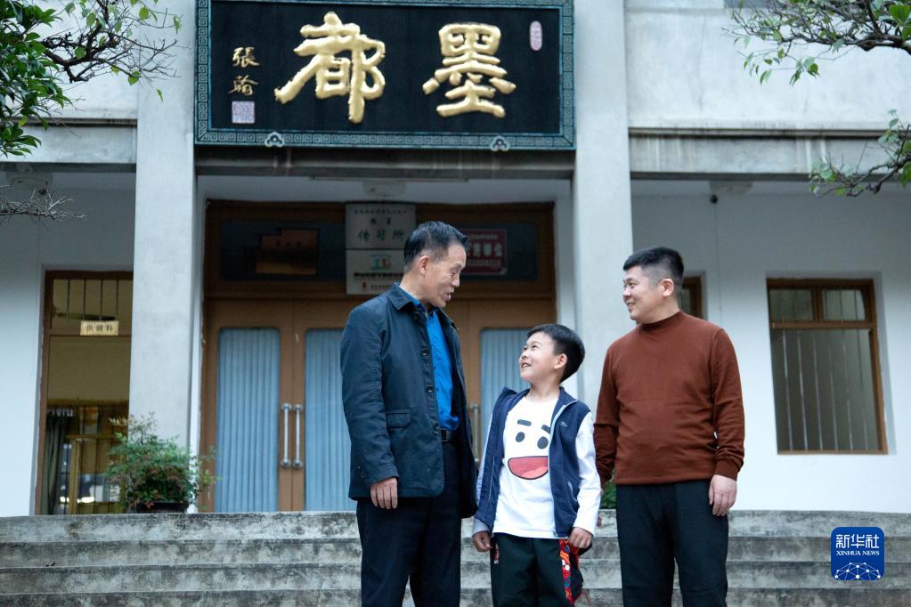 10月24日,在安徽省黃山市歙縣老胡開文墨業有限公司,周美洪(左一)與兒子周?。ㄓ乙唬?、孫子周墨合影。