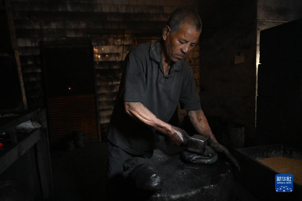 10月25日,在安徽省黃山市歙縣老胡開文墨業有限公司,工人將骨膠與煙灰混合后的墨泥錘打成墨餅。