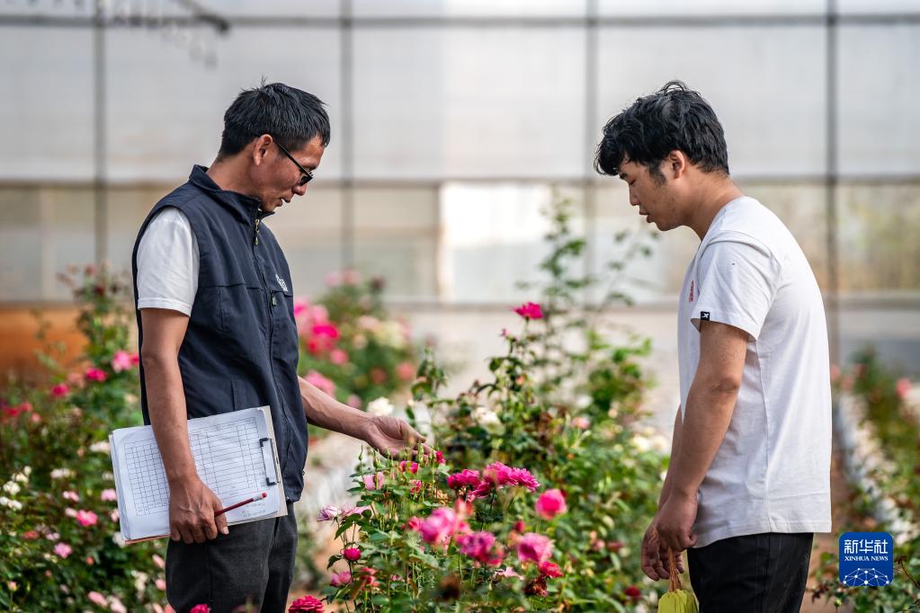 在云南省安寧市現代農業園區玫瑰種植示范園,技術員田連通(左)在和同事交流(10月20日攝)。