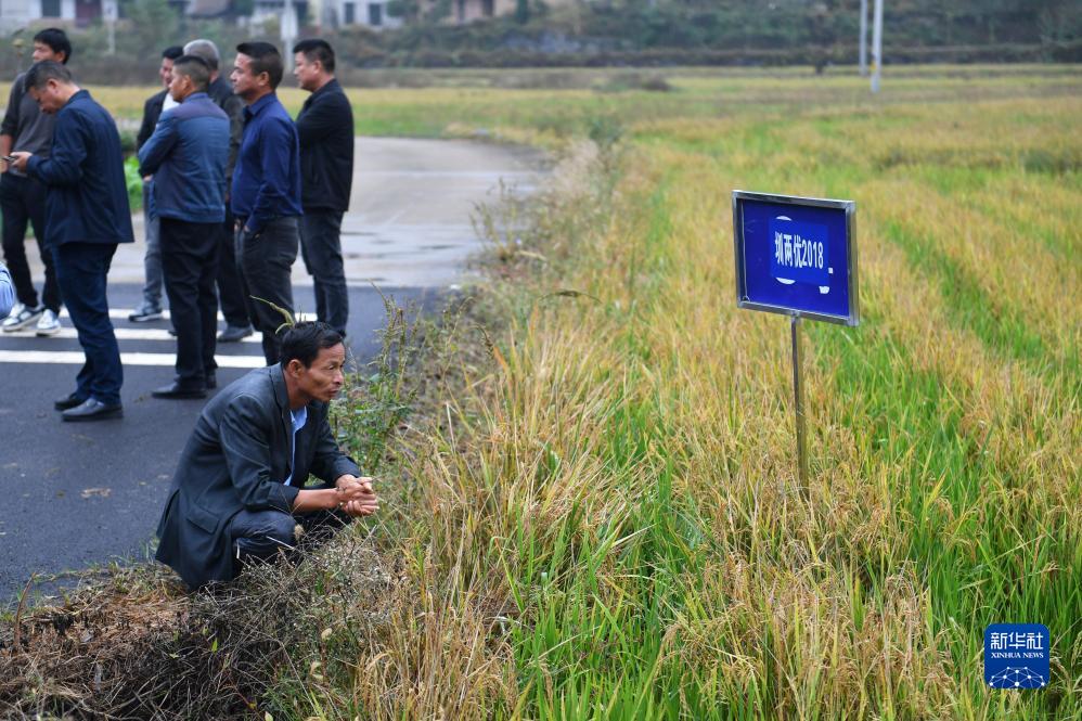 10月28日,在婁底市雙峰縣石牛鄉上茶村,種糧大戶們觀摩不同品種的再生稻。