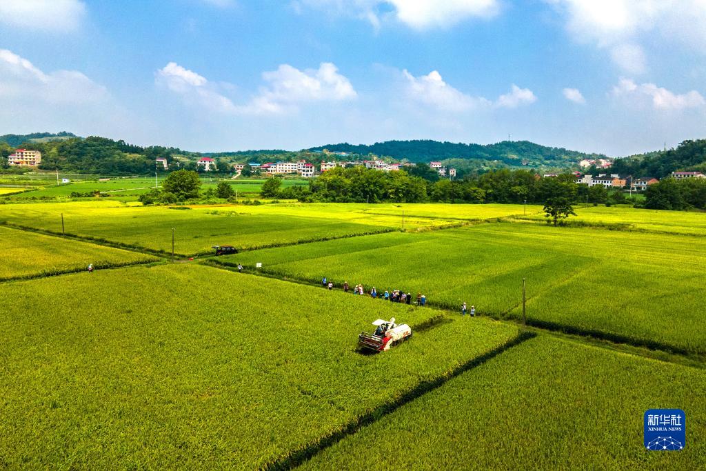 8月10日,在位于婁底市雙峰縣印塘鄉鹽井灣村的“稻再油”示范片,農機手駕駛收割機收割頭季稻谷(無人機照片)。
