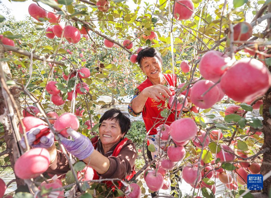 10月28日,在山東省榮成市夏莊鎮一處蘋果園,果農們在采收蘋果。