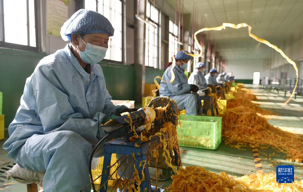 10月28日,村民在禹州市磨街鄉劉門村的加工廠里給柿子削皮,準備制作柿餅。
