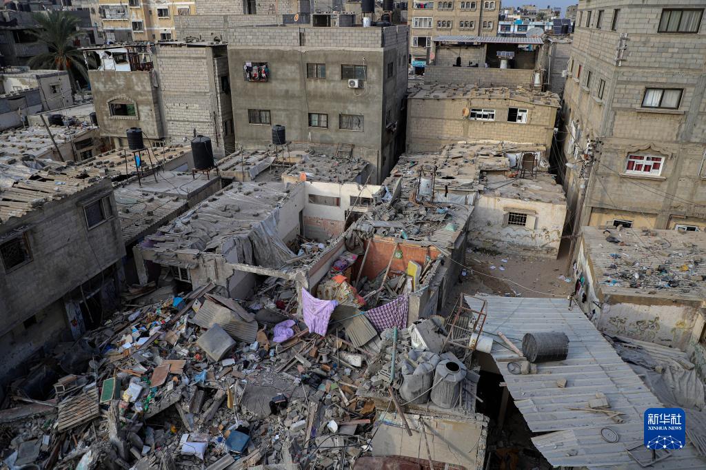 這是10月29日在加沙地帶南部城市汗尤尼斯拍攝的遭以色列襲擊損毀的建筑。