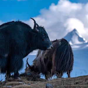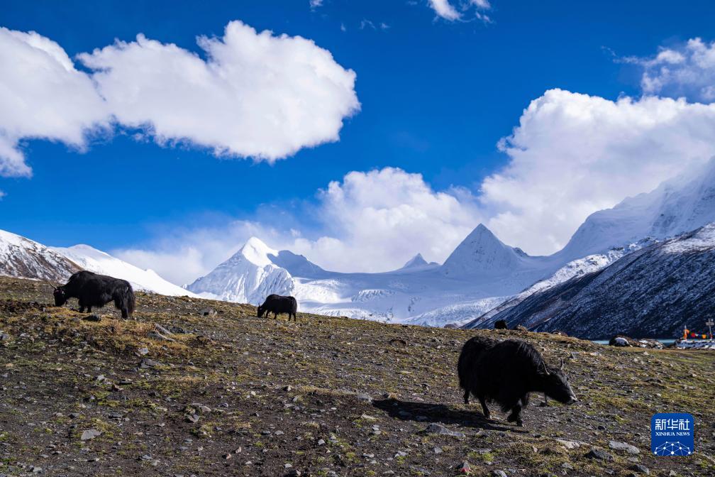 牦牛在薩普雪山腳下的草場上吃草(10月28日攝)。