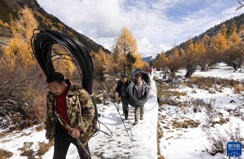 10月29日,工作人員在雪地中搬運通信光纜。