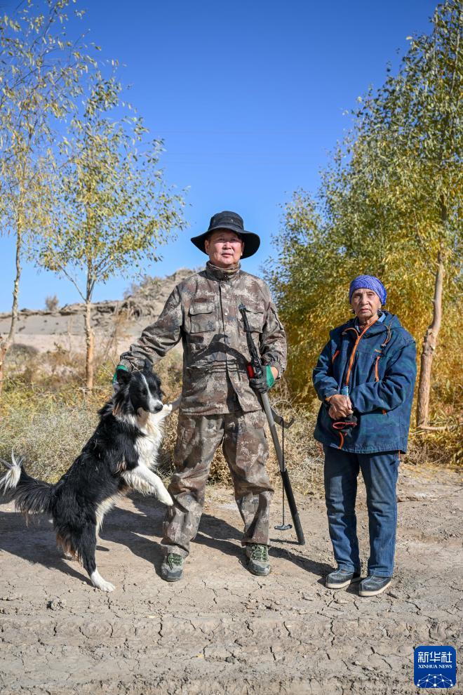 10月28日,德力格(右)和兒子蘇虎慶在修剪完的胡楊樹旁合影。
