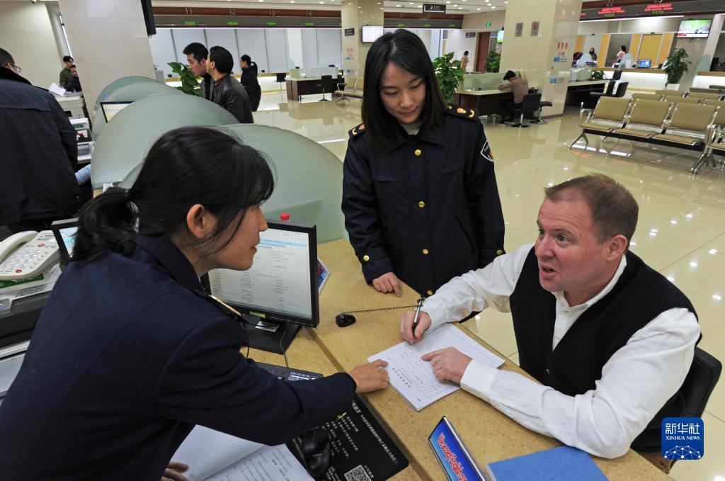 2019年11月29日,在浙江省義烏市國際貿易服務中心辦事大廳,工作人員在為英國商人泰山(右)提供外貿咨詢服務。近年來,義烏推出一系列“當天申請、當天辦結”的辦事措施,以高效便利的服務優化涉外營商環境。