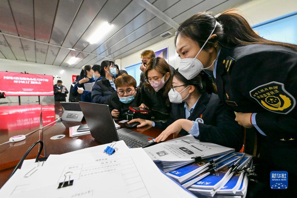 2023年2月22日,在天津市河西區中海環宇城臨時辦公點,天津市河西區政務服務辦公室與天津市河西區市場監管局工作人員為首批入駐的服務業商戶代表提供咨詢講解服務。