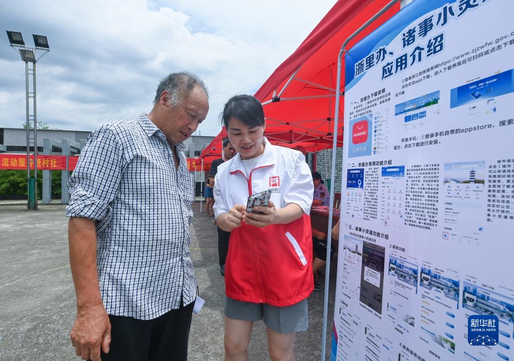 2023年7月3日,浙江省諸暨市店口鎮便民服務中心在上畈村開展政務服務進村入社“流動服務”活動,村級代辦員在給村民講解“諸事小靈通”APP的使用方法。