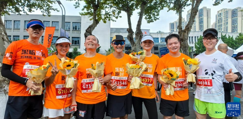 “黑暗跑團”視障跑者孔祥明(左三)完成2023成都馬拉松半程比賽后與陪跑志愿者鄒曉海(左一)、方琪(左二)、張志宏、吉麗華、蘇航、白俊烽(右四至右一)合影(10月29日攝)。
